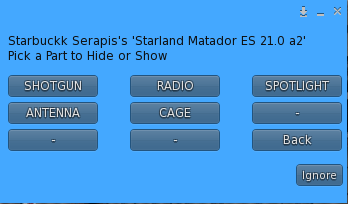 The Matador comes with both the Starland Painter HUD and the Starland Themer HUD. The themer includes three sample paint themes and a blank theme to clear the themed paints from the car to allow tint painting. More detailed instructions for the paint HUDS can be found at Painting and Theming on this site.