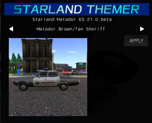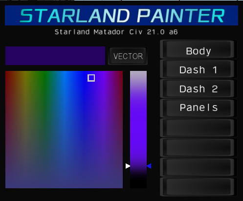 Most Starland Generation2 (GEN2) vehicles can be painted either with a solid color based on setting the surface color, or for some vehicles, a texture based paint to allow multi-tone body along with logos as needed for special purpose / fleet usage. Two different HUDs are available to allow you to paint your car:
